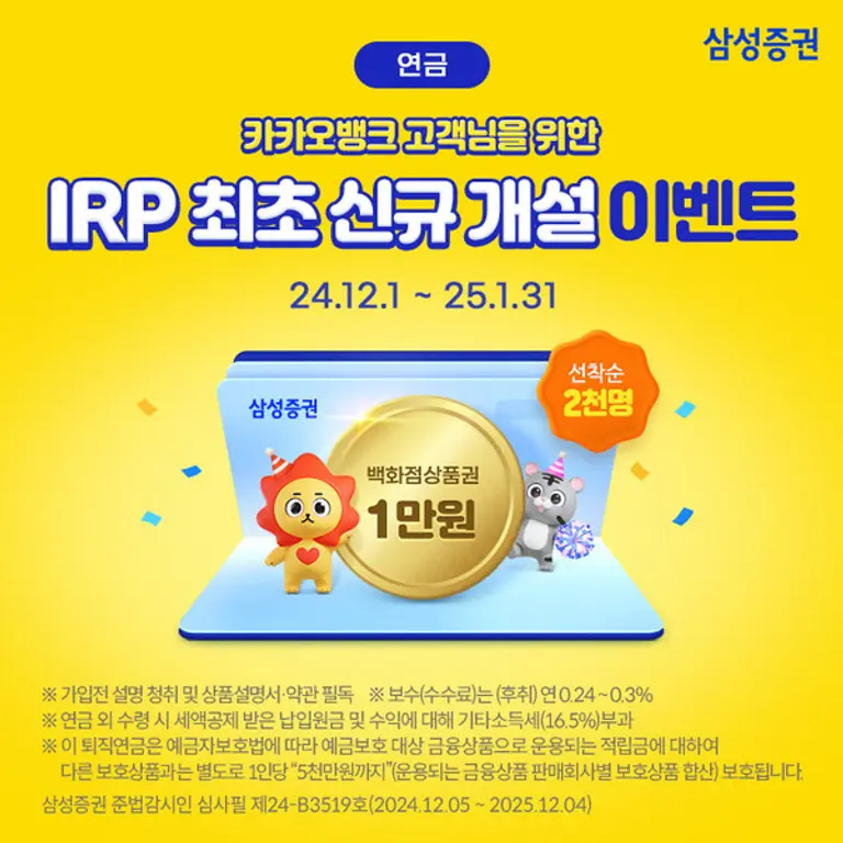 먼저, 카카오뱅크를 통해 삼성증권 IRP 계좌를 최초로 신규 개설하는 고객 대상으로 선착순 2천명에게 모바일 상품권 1만원을 지급하는 이벤트를 2025년 1월 31일까지 진행한다.
