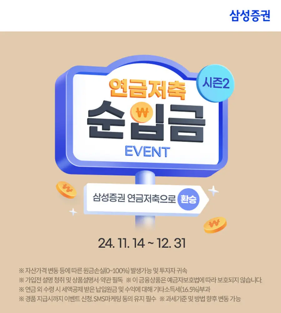 |스마트투데이=김세형 기자| 삼성증권이 '연금저축 순입금 이벤트'를 12월말까지 진행한다고 16일 밝혔다.