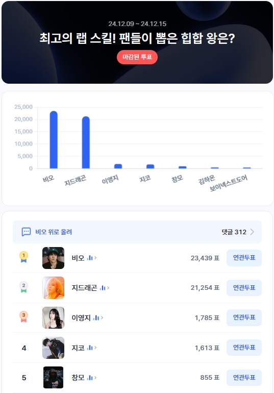 다음 주 투표에서는 비오가 1위를 지킬 수 있을지, 지드래곤이 재도약에 성공할지, 혹은 또 다른 힙합 강자가 등장할지 팬들의 관심이 집중되고 있다.
