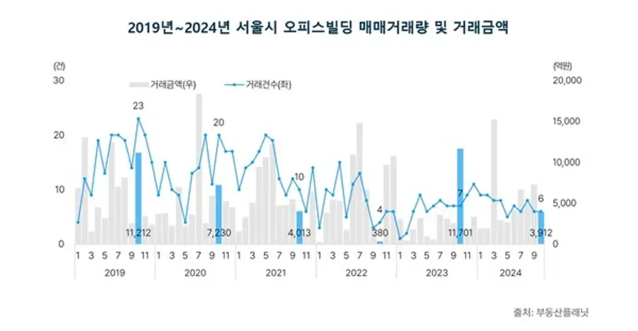 상업용 부동산 전문 프롭테크 기업 부동산플래닛이 17일 발표한 '10월 서울시 오피스 매매 및 임대시장 동향 보고서'에 따르면 오피스빌딩 거래는 9월과 같은 6건을 기록했지만 거래금액은 전월 7333억원보다 46.7% 줄어든 3912억원으로 조사됐다. 작년 같은 기간의 거래금액 1조1701억원 대비 무려 66.6%가량 하락한 수치다.