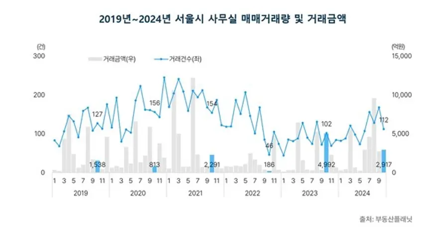 |스마트투데이=이재수 기자| 서울 오피스빌딩 거래금액이 절반 가까이 하락한 것으로 나타났다. 사무실 거래량 역시 30% 넘게 감소했다.