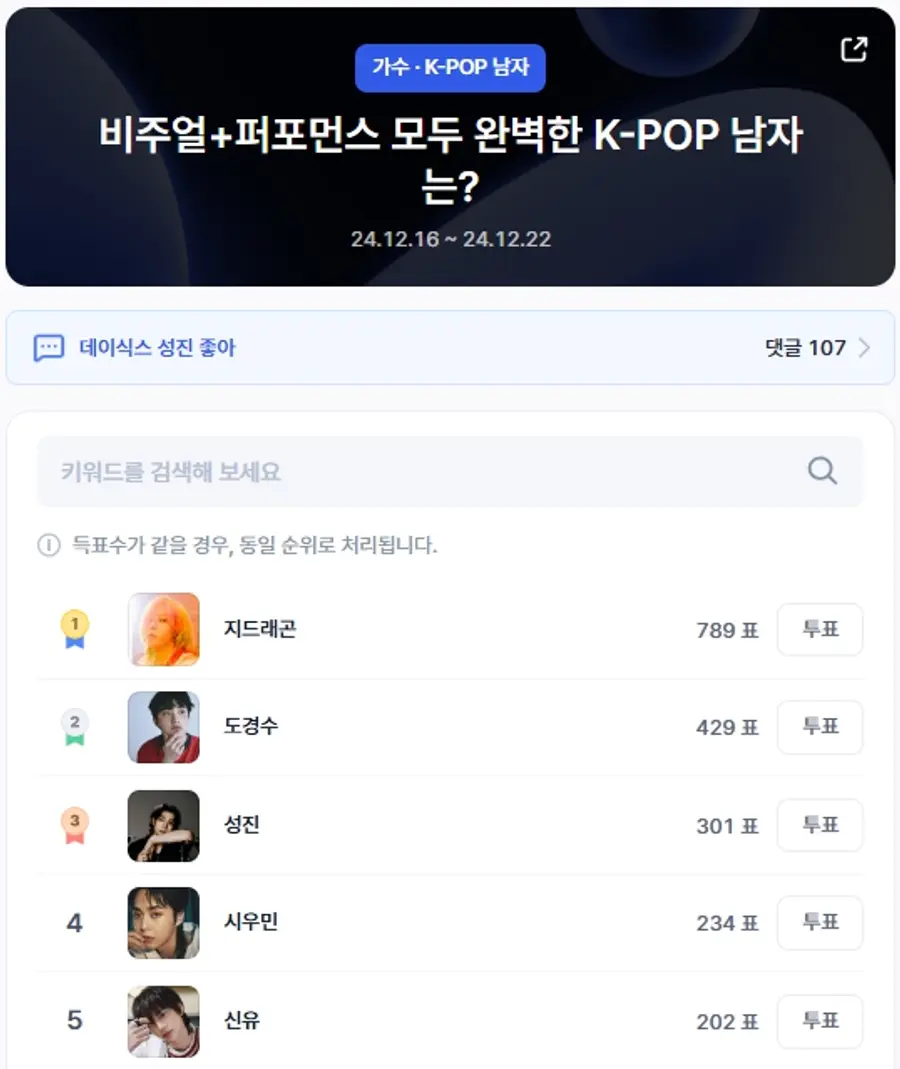 |스마트투데이=박지환 기자| 디시트렌드에서 진행 중인 ‘비주얼+퍼포먼스 모두 완벽한 K-POP 남자는?’ 투표가 팬들의 뜨거운 관심 속에 순항 중이다. 12월 16일부터 시작된 이번 투표에서 지드래곤이 789표를 얻으며 1위를 기록 중이다. 도경수와 성진이 뒤를 바짝 쫓으며 투표 막바지 경쟁이 더욱 치열해질 것으로 보인다.