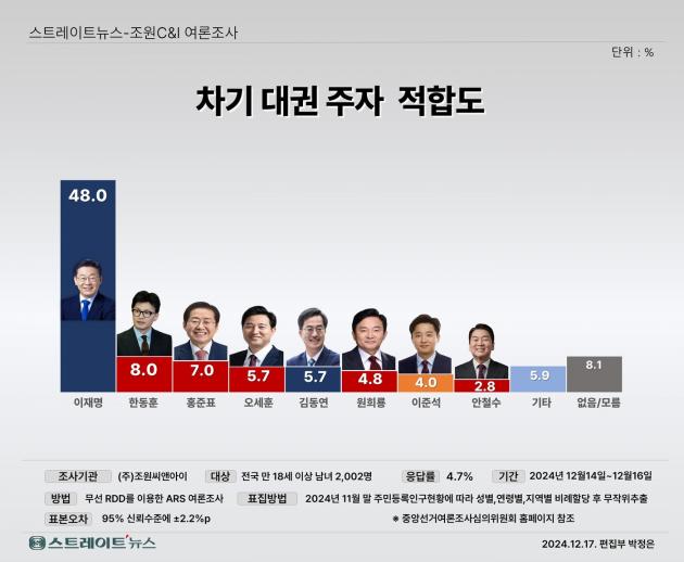 차기 대권주자 적합도에선 이재명 대표가 48.0%로 1위를 달렸고 한동훈 전 대표(8.0%), 홍준표 시장(7.0%), 오세훈 시장(5.7%), 김동연 경기도지사(5.7%), 원희룡 전 국토부 장관(4.8%), 이준석 개혁신당 의원 (4.0%), 안철수 국민의힘 의원(2.8%) 순이었다. 기타와 모름은 각각 5.9%, 2.6%였다.