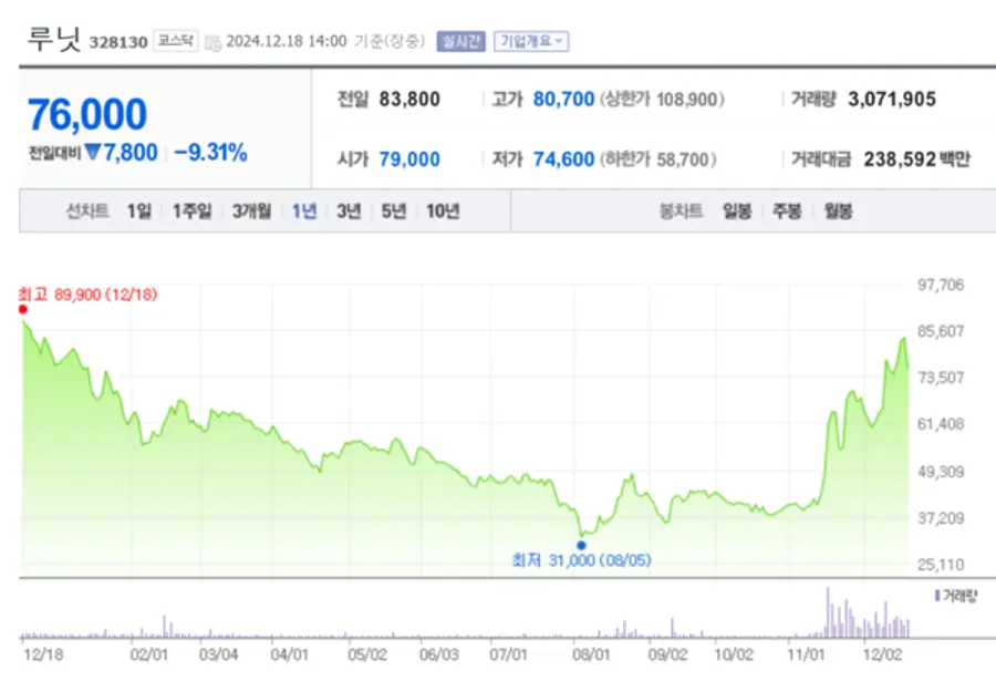 루닛 주가는 지난달 15일 이후 급등세를 이어오면서 연중 고점을 기록 중에 있었다. 8월5일 블랙먼데이에 비해선 150% 이상 상승한 상태였다.