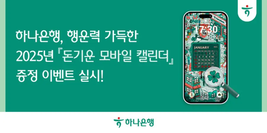 하나은행 리테일사업부 관계자는 “2025년 푸른뱀의 해를 맞아 손님들께 일상 속 행운을 전하고 부자가 되기를 기원하는 마음을 담아 ‘돈기운 모바일 캘린더’ 증정 이벤트를 마련했다”며 “2025년 12월까지 매월 다양한 이벤트와 혜택이 가득한 모바일 캘린더를 증정받고 뜻깊은 한 해를 보내시기 바란다”라고 밝혔다.