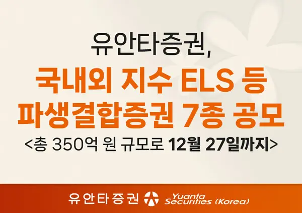 |스마트투데이=김세형 기자| 유안타증권은 12월 27일까지 조기 상환형 ELS 등 파생결합증권 7종을 총 350억 원 규모로 공모한다.