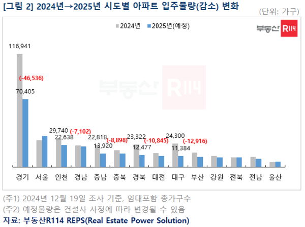 반면 서울은 올해보다 4462가구가 증가하고, 울산(911가구), 제주(511가구)에서도 입주 물량이 증가할 예정이지만, 이들의 증가폭은 미미해 시장에 미치는 영향은 크지 않을 것으로 분석된다.