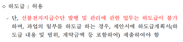 통합디지털온누리상품권 제안요청서에 일부 과업을 하도급으로 운영할 경우 하도급계획서(하도급의 내용 및 범위, 계약금액 등 포함하여)를 제안요청서 제출시 같이 제출하기로 되어 있다. 조폐공사에 문의를 하였으나 확인을 해 줄 수 없다라는 답변을 받았다. 만약 이를 준수하지 않고 하도급을 진행하였다면 공공기관이 하지 말아야 할 모랄헤저드를 넘어 범법 행위로 볼 수 있다.