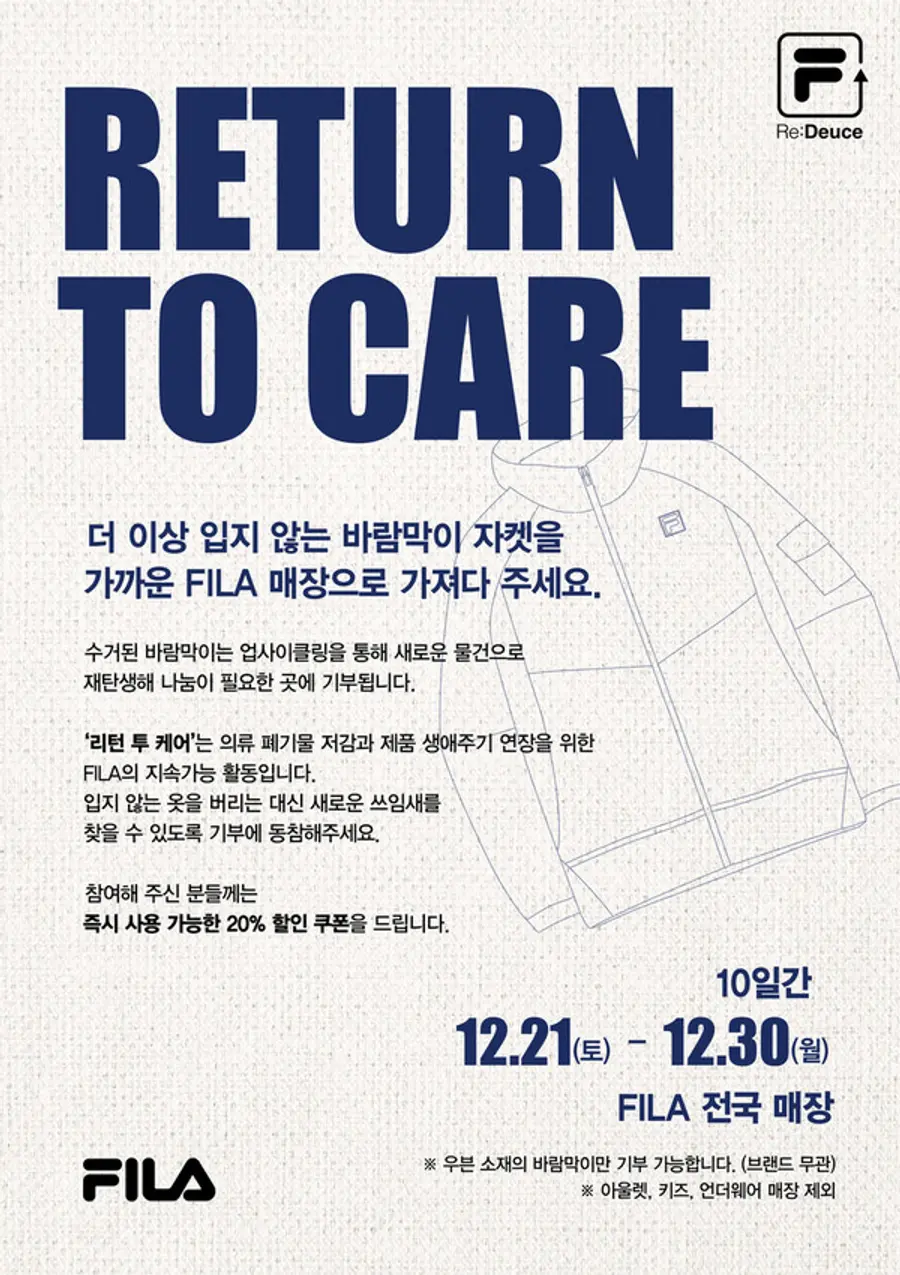 휠라코리아 관계자는 “리턴 투 케어 캠페인은 단순한 기부를 넘어 의류 폐기물 문제 해결과 생애주기 연장을 위한 지속가능성을 위한 휠라의 노력을 보여주는 대표적인 활동”이라며 “앞으로도 휠라는 지속가능한 미래를 만들기 위해 진정성 있는 사회 공헌 활동을 펼쳐 나갈 것”이라고 말했다.