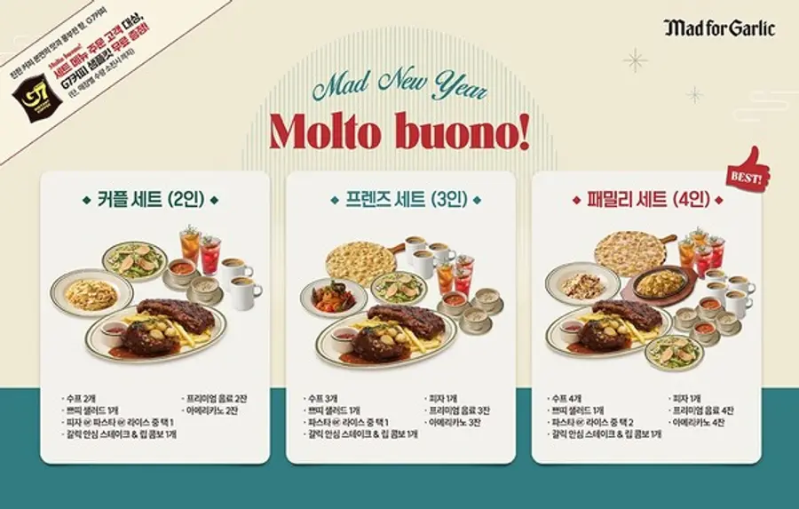 이탈리아어로 ‘정말 맛있다’는 의미를 담고 있는 ‘몰토 부오노(Molto buono)’를 콘셉트로 커플 세트(2인), 프렌즈 세트(3인), 패밀리 세트(4인)으로 선보이는 ‘매드 뉴 이어’ 세트는 12월 19일부터 내년 2월 말까지 약 두 달 동안 한정 판매한다.