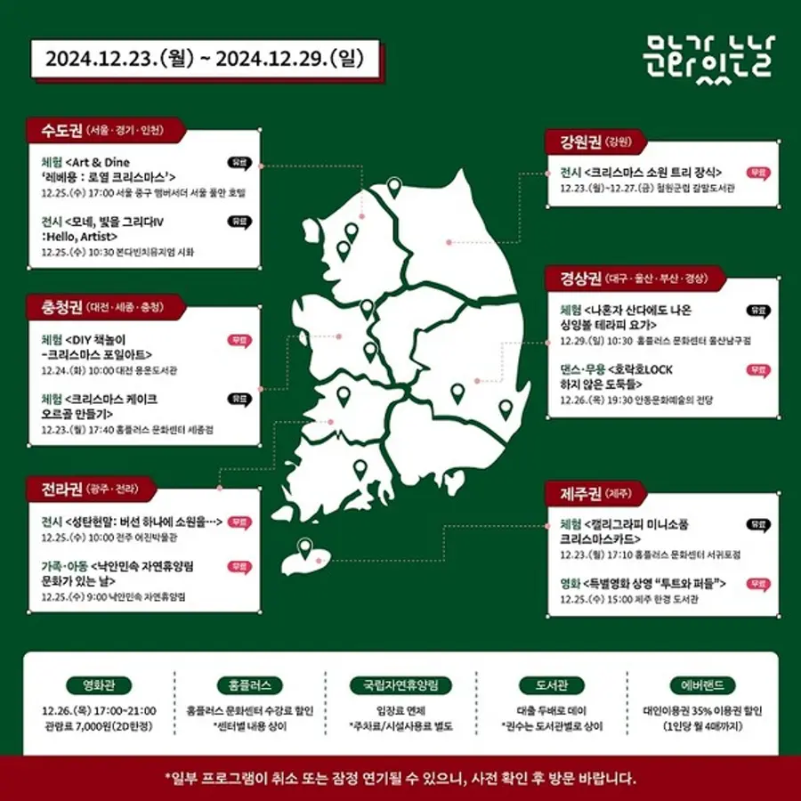 |스마트투데이=이은형 기자 | 문화체육관광부(장관 유인촌)와 지역문화진흥원(원장 정광렬)은 12월 ‘문화가 있는 날’ 주간을 맞아 전국에서 콘서트, 영화, 전시, 체험, 보드게임 등 다채로운 문화 혜택을 제공한다고 24일 밝혔다.