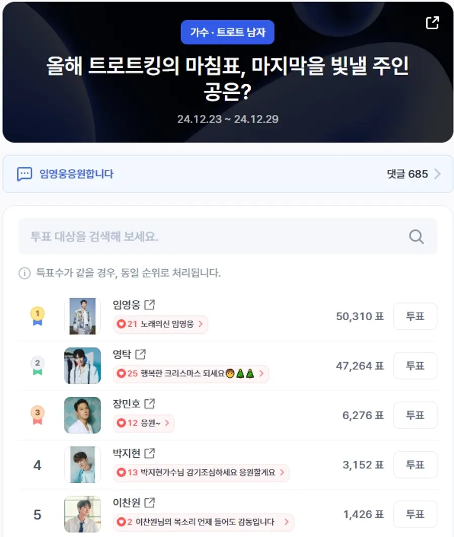 |스마트투데이=박지환 기자| 디시트렌드가 진행한 ‘올해 트로트킹의 마침표, 마지막을 빛낼 주인공은?’ 투표에서 임영웅이 50,310표를 기록하며 1위를 차지했다. 이번 투표는 12월 23일부터 29일까지 진행 중이며, 팬들의 열띤 참여 속에 막바지를 향하고 있다.