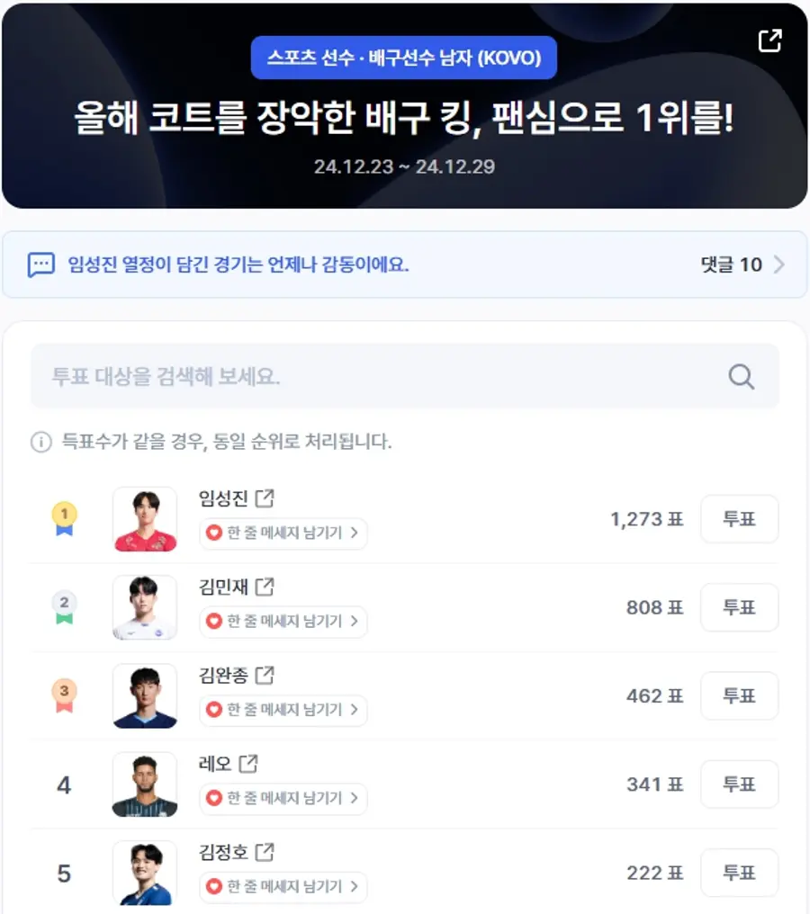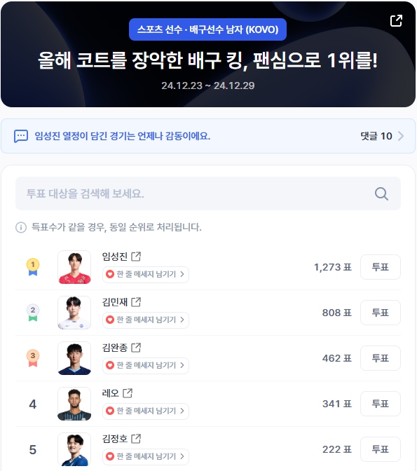 |스마트투데이=박지환 기자| 2024년 남자 배구 선수들의 팬심을 가르는 투표가 치열하게 진행되고 있다. 디시트렌드에서 주최한 이번 투표는 "올해 코트를 장악한 배구 킹, 팬심으로 1위를!"이라는 주제로, 12월 26일 오전 기준 임성진이 1,273표로 선두를 유지하고 있다.