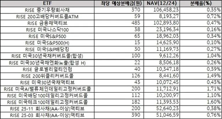 |스마트투데이=김세형 기자| KB자산운용은 26일 12월 라이즈(RISE) ETF별 분배금 내역을 공지했다. 지급기준일은 오는 30일, 지급예정일은 1월3일이다.