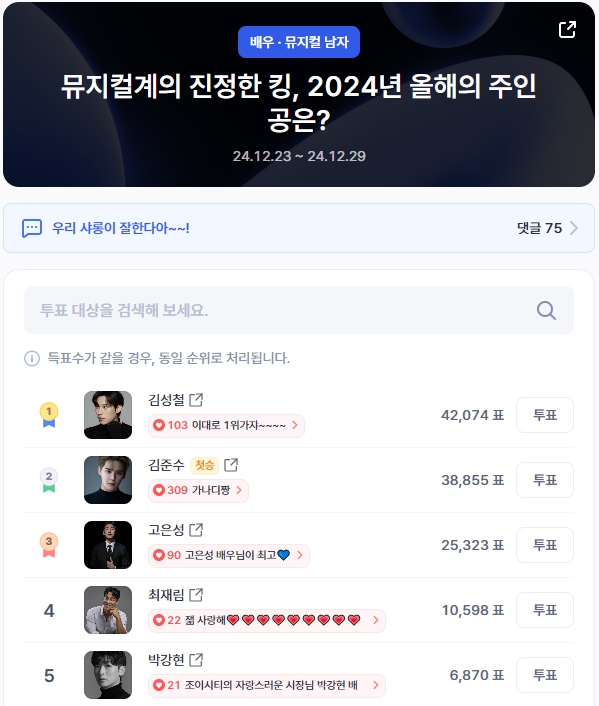 27일 오후 1시 40분 기준으로 김성철 배우가 42,074표로 1위를 달리고 있으며, 김준수가 38,855표로 바짝 뒤쫓고 있다. 고은성이 25,323표로 3위를 기록하며 뮤지컬 무대를 장악하고 있다.