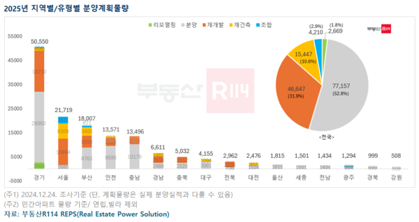 2025년 아파트 분양 물량 중 자체사업(도급포함)은 53%(7만7157가구), 정비사업(리모델링 포함)은 47%(6만8973가구)로 집계됐다. 수도권을 중심으로 정비사업 물량이 소진 정비사업은 전년 대비 감소하는 것으로 분석된다. 내년도 대규모 정비사업(1000세대 이상)은 서울에서는 래미안원페를라(1097가구)가 유일하고, 경기도는 고양원당더샵포레나(2601가구), 의왕고천나재개발(1913가구), 딸기원2지구재개발(1096가구) 등이 계획돼 있다.