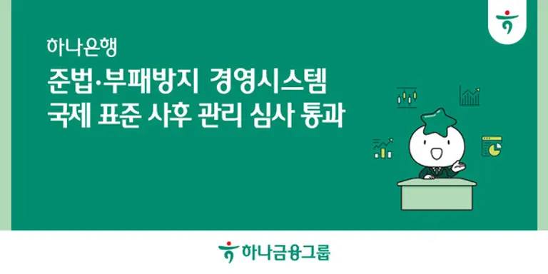 하나은행은 작년 12월 시중은행 최초로 ISO 37301과 ISO 37001 인증을 동시에 획득한 후 올해 사후관리 심사를 통과해 인증을 유지했다.