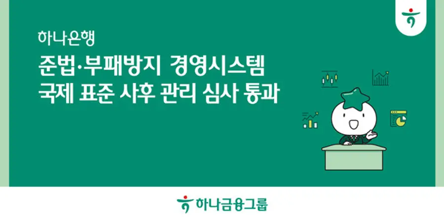 |스마트투데이=김국헌 기자| 하나은행은 한국표준협회(KSA)가 실시한 준법경영시스템(ISO 37301)과 부패방지경영시스템(ISO 37001) 국제표준의 사후관리 심사를 통과했다고 30일 밝혔다.