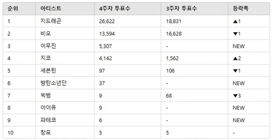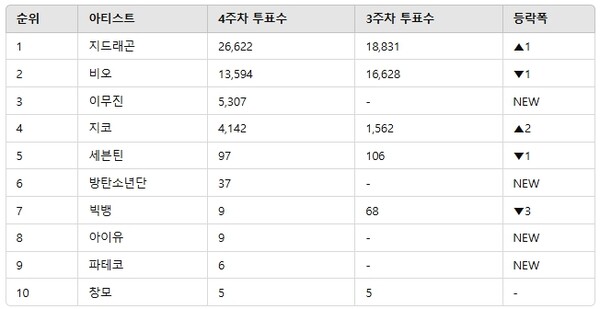 1위를 차지한 지드래곤은 전주 대비 7,791표가 상승하며 독보적인 지지를 받았다. 반면 비오는 3주차에 비해 소폭 하락하며 2위를 기록했다. 지코는 2계단 상승하며 상위권에 올랐고, 세븐틴은 그룹으로서는 꾸준한 성과를 유지하고 있다. 새롭게 순위권에 오른 이무진, 방탄소년단, 파테코, 아이유는 팬들의 큰 주목을 받으며 새로운 흐름을 보여주었다.