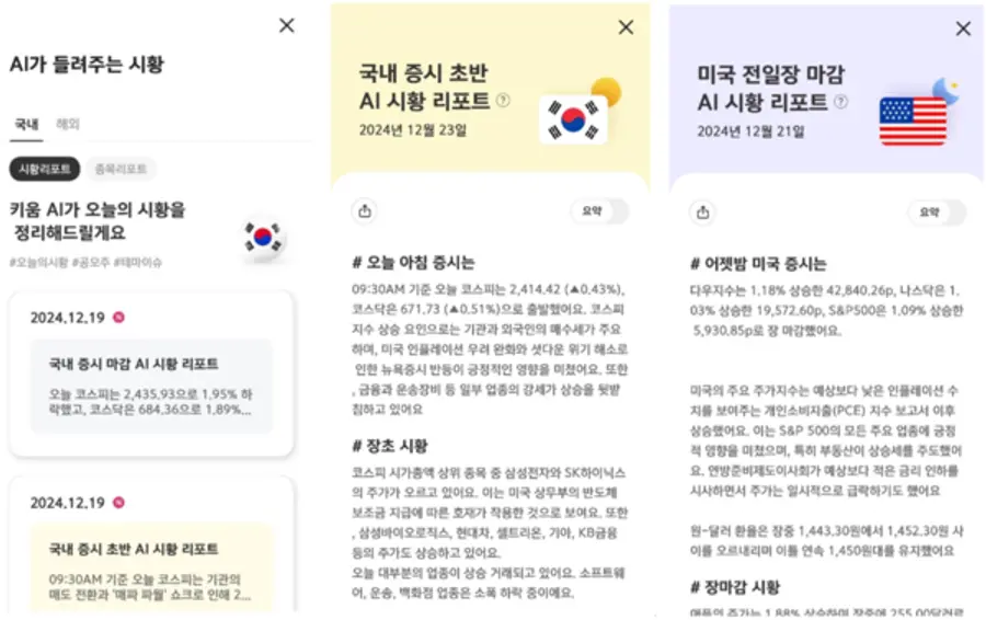 MTS내 리서치 보고서와 뉴스도 AI로 요약해준다. 키움에서 발행하는 리서치센터의 보고서들을 모바일 화면에서 빠르게 확인할 수 있도록 AI가 가공해 이해하기 쉽게 정리해준다. 실시간 뉴스도 AI 세줄 요약 버튼을 누르면 뉴스의 핵심내용을 뽑아 3줄로 요약해 제공한다.