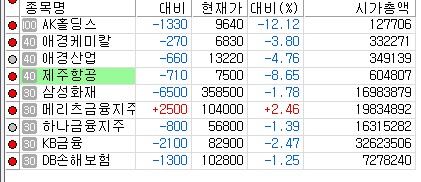 애경케미칼과 애경산업은 각각 3.80%(270원), 4.76%(660원) 되밀리며, AK애경그룹 상장 4개사가 모두 하락 마감했다. 제주항공의 간사보험사인 삼성화재도 1.78% 하락했다.