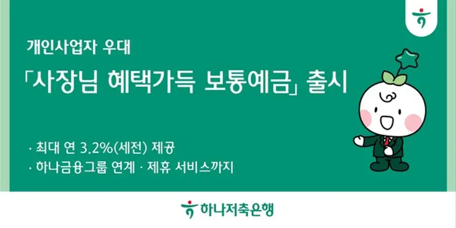 |스마트투데이=김국헌 기자| 하나저축은행은 최고 금리 연 3.2%의 개인사업자 전용 상생금융 상품 ‘사장님 혜택 가득 보통예금’을 출시했다고 31일 밝혔다.