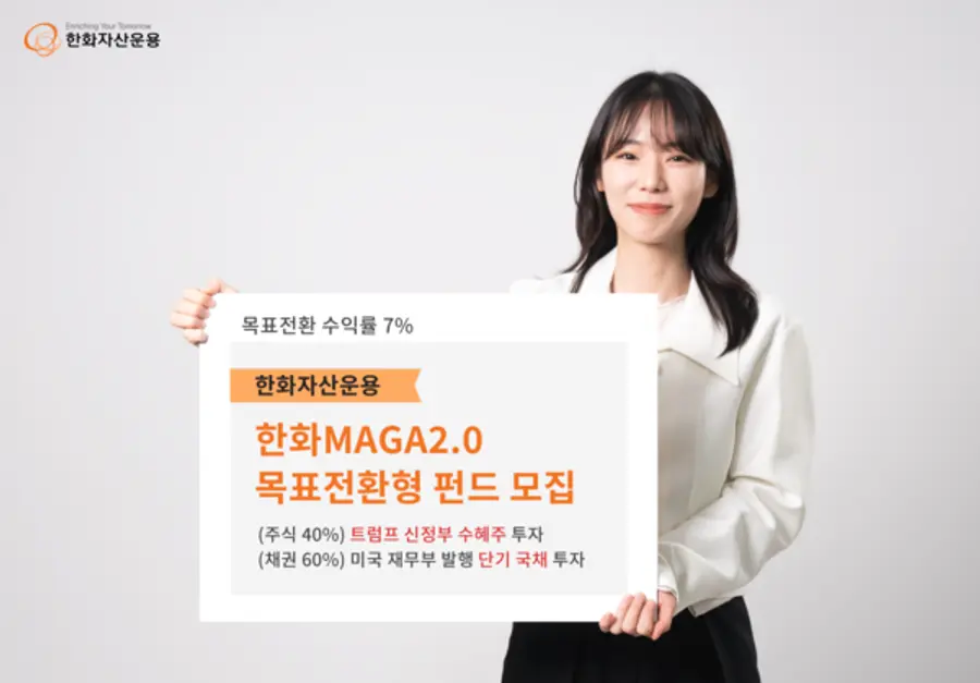 '한화MAGA2.0목표전환형' 펀드는 트럼프 신정부 수혜가 예상되는 해외 주식에 40% 수준, 듀레이션(투자자금의 평균회수기간) 2년 이내의 미국 단기 국채에 60% 수준으로 투자하는 채권혼합형 펀드로 7% 수준의 목표 수익을 추구한다. 목표 수익률 달성 후에는 수익변동성을 최소화하기 위해 국내 채권 관련 펀드 등 안정적인 채권자산으로 전환되는 목표전환형펀드다.