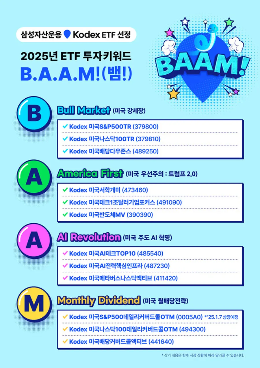 올해에도 견조한 미국 경기를 바탕으로 미국이 주도하는 주식시장이 될 것으로 전망하고 있다. 이에 2025년 유망 투자처를 ‘미국’으로 선정하고, ‘B.A.A.M’ 투자 전략 키워드 4개와 각 분야에 따른 추천 KODEX ETF 총 12종을 제시했다.