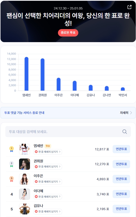 이번 투표에서는 염세빈이 12,817표로 1위를 차지하며 치어리더 팬들에게 압도적인 사랑을 받았다. 권희원이 12,270표로 2위, 이주은이 4,893표로 3위를 기록하며 치열한 경쟁을 펼쳤다.