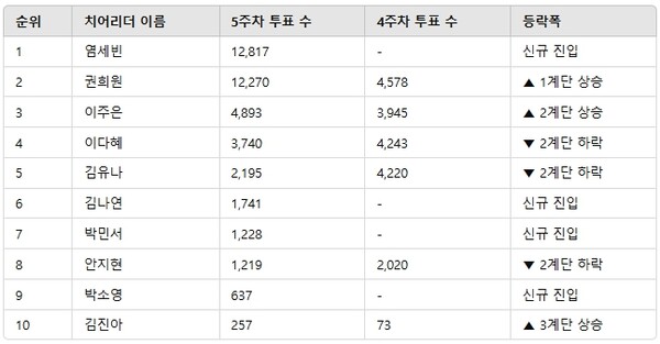 염세빈은 이번 투표에서 새롭게 진입하며 1위에 오르는 쾌거를 이루었다. 2위에 오른 권희원 역시 지난 4주차보다 1계단 상승하며 팬들의 꾸준한 사랑을 입증했다. 이주은은 2계단 상승하며 3위에 자리했고, 이다혜와 김유나는 각각 2계단씩 하락했지만 상위권을 유지하며 여전히 많은 팬들의 지지를 받고 있다.