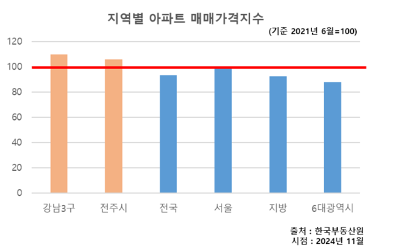 7일 한국부동산원자료에 따르면 2024년 11월 기준 전주시 아파트 매매가격지수는 106.2로 서울 강남3구에 육박하는 수치를 보였다. 작년 11월 기준 강남3구 아파트 매매가격지수는 △서초구 113.0 △강남구 108.7 △송파구 108.2로 기록했다.