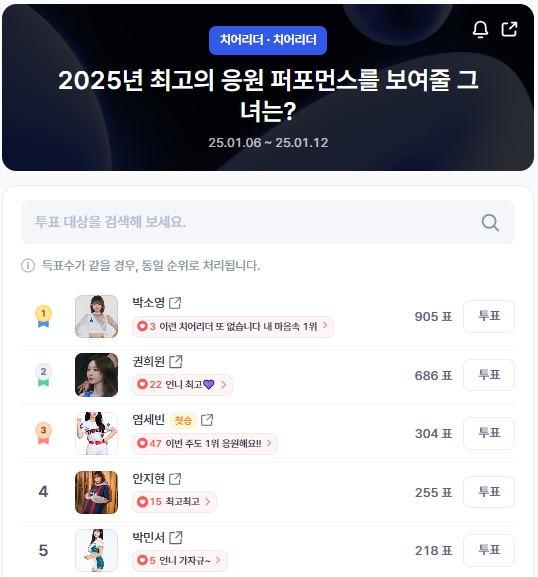 1위는 박소영으로, 905표를 기록하며 선두를 굳건히 지키고 있다. 팬들은 그녀의 열정적이고 독창적인 퍼포먼스에 큰 호응을 보내고 있다. 특히 "이번 치어리더는 박소영뿐이다"라는 팬들의 강한 지지 발언이 투표 결과에 영향을 미친 것으로 보인다.