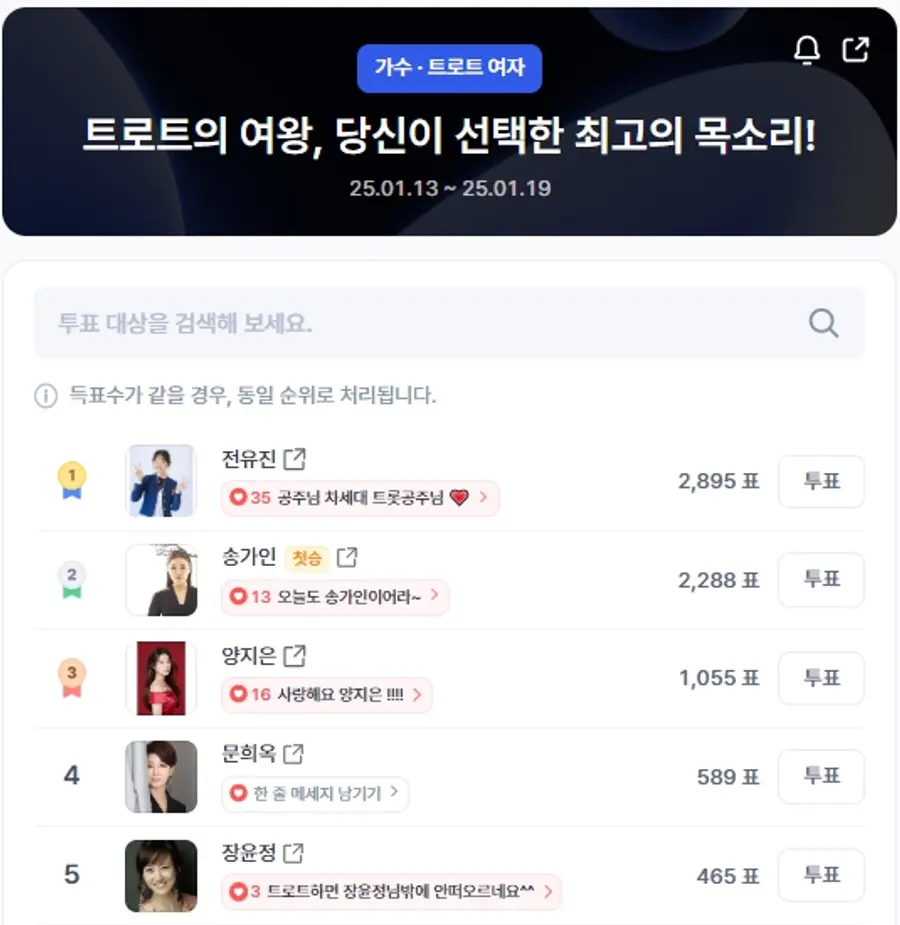 4위와 5위에는 각각 문희옥(589표)과 장윤정(465표)이 이름을 올렸다. 문희옥은 트로트의 전설적인 인물로, 깊은 감성과 내공으로 여전히 팬들의 지지를 받고 있으며, 장윤정은 '트로트 여왕'으로서의 저력을 다시 한번 보여주고 있다.