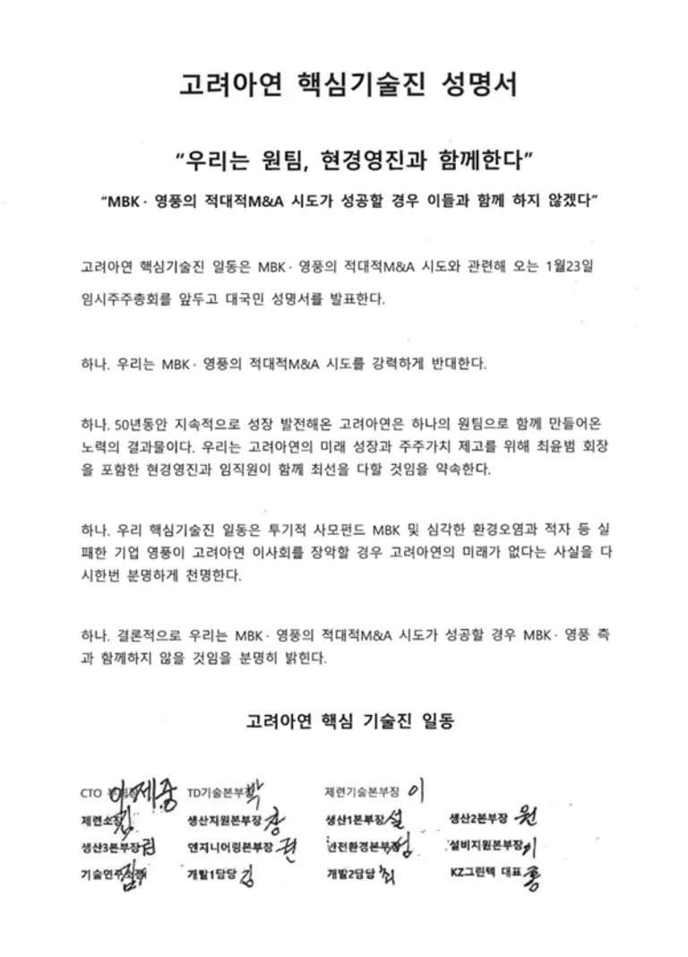 고려아연의 핵심 기술진들은 "우리는 MBK·영풍의 적대적 M&A 시도를 강력하게 반대한다"며 "MBK·영풍의 적대적 M&A 시도가 성공할 경우 MBK·영풍 측과 함께하지 않을 것"이라고 공언했다.
