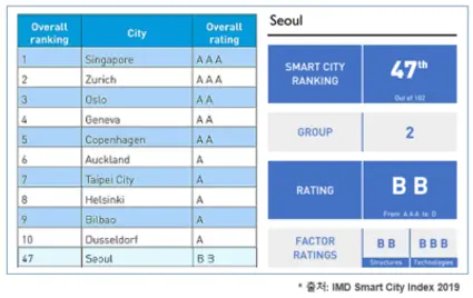 스마트 국가, 스마트시티 구현을 위한 ‘역대급’ 정책이 발표되고, 실행될 우리에게 이러한 IMD의 스마트시티 인텍스가 시사하는 바는 분명하다. 앞으로 5년 동안 총사업비 160조원(국비 68.7조원)이 투자될 ‘스마트 국가(똑똑한 나라)’ 창출과 스마트시티 구축에 있어서 근간이 될 스마트 테크놀로지가 국민과 시민들의 요구를 충족시킬 수 있도록 해야 한다는 것이다.