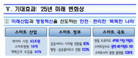 구체적으로 살펴보자면 ▲스마트 산업에서는 데이터 시장 43조원, 스마트병원 18개, 재택근무 도입율 40%, ▲스마트 정부에서는 공공서비스 디지털 전환율 80%, 행정ㆍ공공클라우드 전환 100% 그리고 ▲스마트 국토에서는 정밀 도로지도(4차로 이상 지방도), 스마트상수도(광역 48, 지방도 161) 스마트시티 통합 플랫폼 108개 등의 실현을 통해 “안전ㆍ편리한 ‘똑똑한 나라’”가 될 것이라고 기대하고 있다.