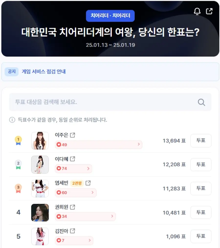 6위 남민정(328표), 7위 오윤솔(308표), 8위 김도아(138표), 9위 이소영(134표), 10위 김나연(129표) 등 치어리더들의 경쟁은 끝날 때까지 알 수 없는 접전 양상이다.