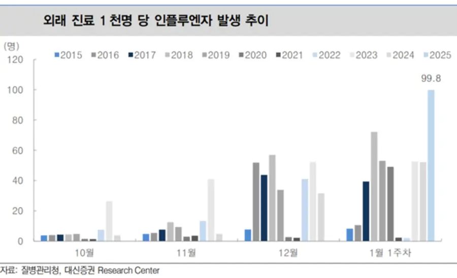 질병관리청에 따르면, 지난 5일부터 11일까지 의원급 300개소 인플루엔자 표본감시 결과, 인플루엔자(독감) 의심(의사) 환자는 병원을 찾은 환자 1천 명당 86.1명을 기록했다. 전주 대비 13.7% 줄었지만, 지난 2016년 이후 평년 정점보다 높은 수준이라고 질병관리청은 설명했다.