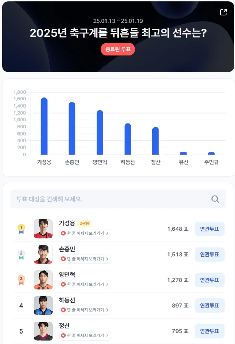 1월 20일부터 1월 26일까지 축구 팬 투표가 진행된다. 기성용의 3주 연속 1위 달성이 가능할지, 손흥민과 양민혁의 역전이 기대되는 한 주다. 팬들의 열띤 응원이 순위를 뒤바꿀 수 있다.