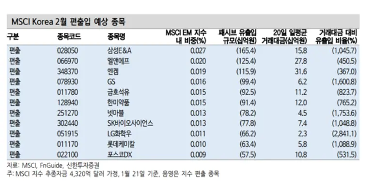 |스마트투데이=김세형 기자| 신한투자증권은 2월 MSCI 코리아 지수 정기 변경에서 삼성E&A와 엘앤에프, 엔컴 등 11개사가 무더기로 편출될 것으로 전망했다.