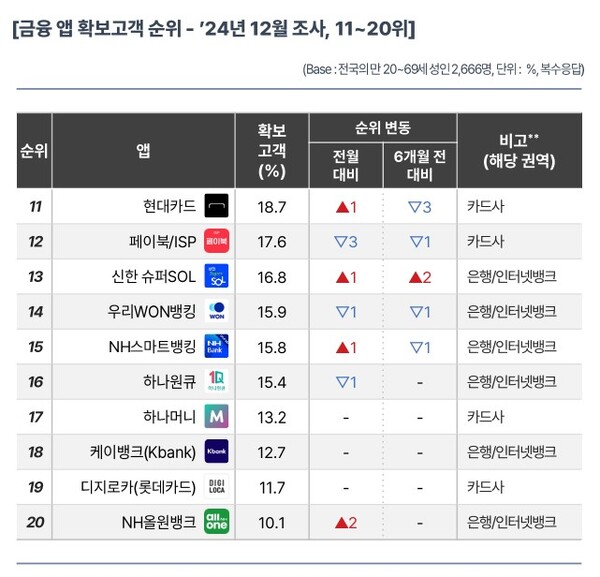 10위권에 오르내리던 현대카드가 11위에 랭크됐고, 페이북?ISP 전월 대비 3계단 하락해 12위를 기록했다.