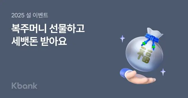 케이뱅크 앱에서 ‘복주머니 선물하기’ 링크를 지인과 공유하면, 세뱃돈을 1원~1천원 무작위로 지급한다. 링크를 받은 지인도 랜덤 세뱃돈을 받는다. 링크 공유는 무제한이며, 세뱃돈은 최대 20만원까지 지급한다.