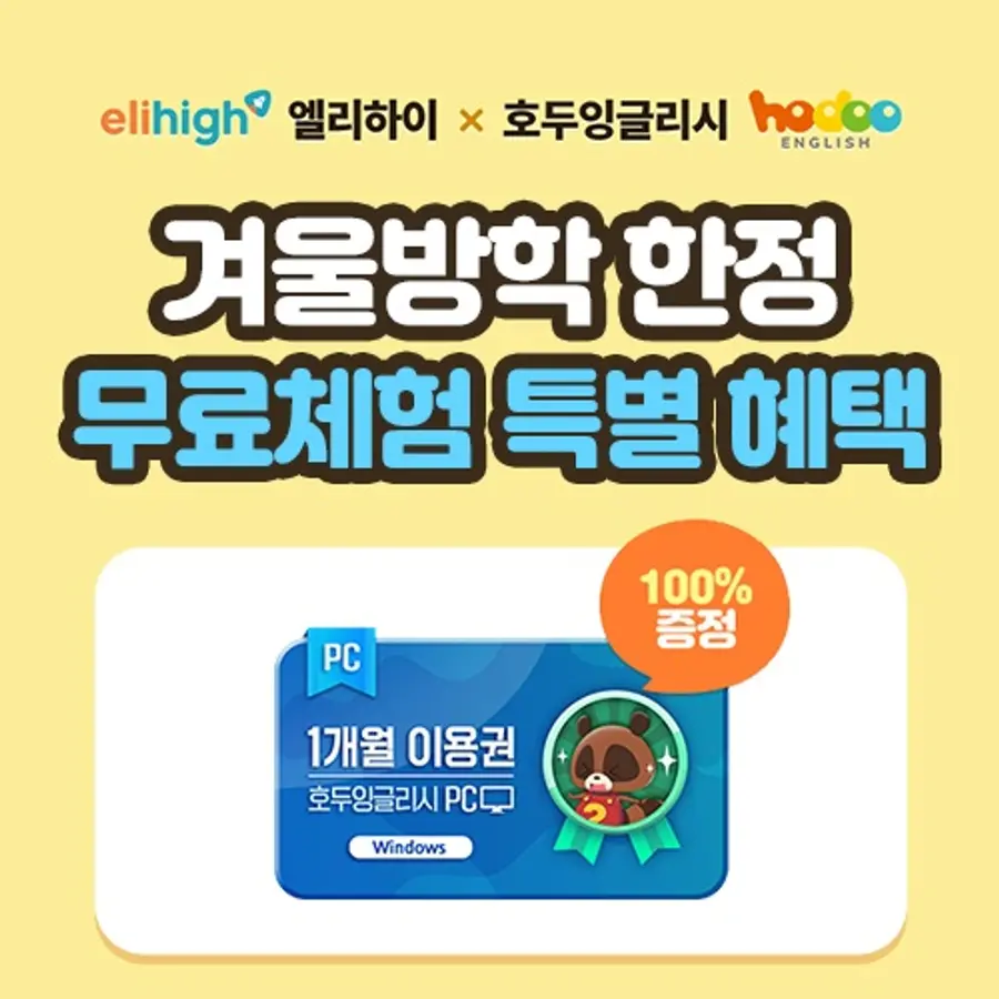 |스마트투데이=김윤진 기자| 메가스터디교육의 초등 인강 1위(2024 한국소비자평가 1위, 초등온라인교육 부문) 엘리하이가 겨울방학을 맞아 무료 체험 회원들을 대상으로 호두잉글리시 PC 1개월 이용권을 증정한다고 23일 밝혔다.