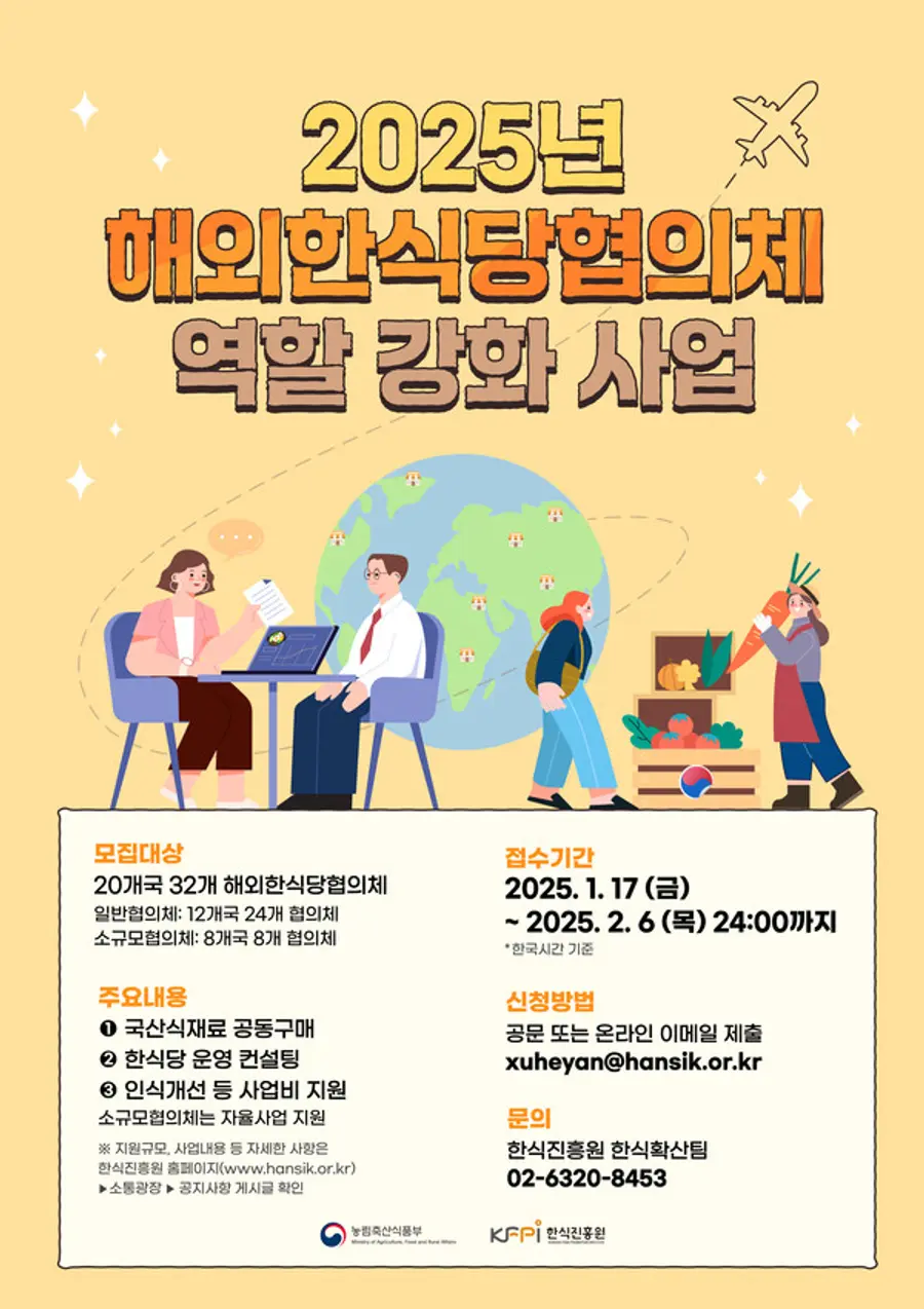 |스마트투데이=이재수 기자| 농림축산식품부와 한식진흥원은 ‘2025년 해외한식당협의체 역할 강화 지원 사업’에 참여할 협의체를 모집한다고 22일 밝혔다.