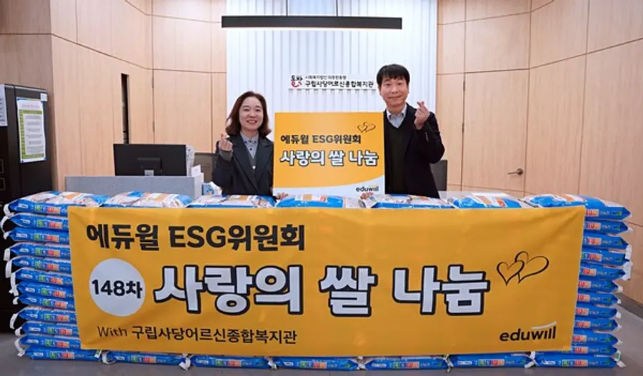 |스마트투데이=김세형 기자| 에듀윌(대표 양형남)은 지난 22일, 서울 동작구에 위치한 ‘구립사당어르신종합복지관’을 방문해 ‘사랑의 쌀’ 100포대를 전달했다고 23일 밝혔다.