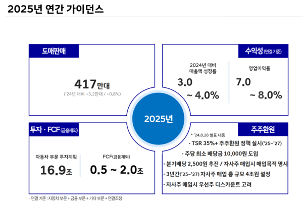 현대차는 올해 판매목표로 417만대를 제시했다. 매출 전망치는 지난해보다 3~4% 수준 성장으로 내놨고, 영업이익은 7~8% 수준을 목표하고 있다고 밝혔다. 올해 16조9000억원 투자계획도 덧붙였다.