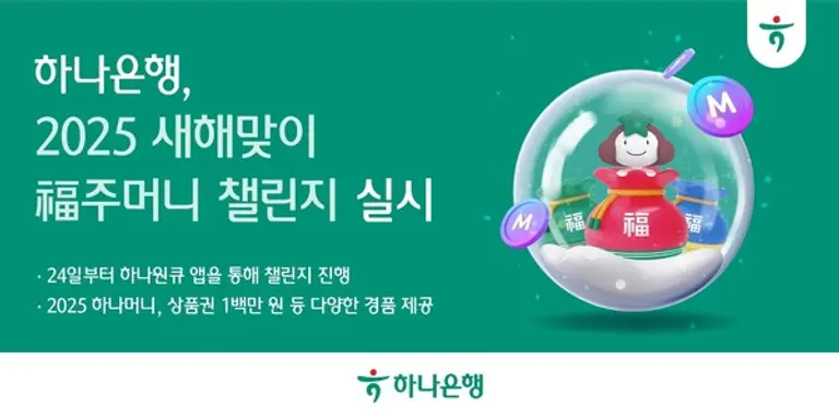|스마트투데이=김국헌 기자| 하나은행은 을사년(乙巳年) 새해를 맞아 하나원큐 앱에서 ‘2025 새해맞이 복(福)주머니 챌린지’를 한다고 24일 밝혔다.