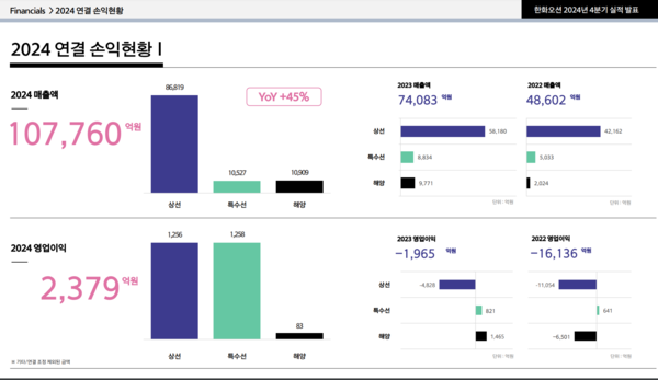 연간 매출은 10조7760억원으로 45.5% 증가했다. 영업이익은 2379억원으로 흑자전환했고, 순이익은 2023년보다 228.2% 급증한 5251억원에 달했다.