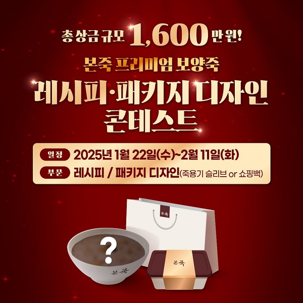 이의 일환으로 본아이에프는 지난해 ‘본죽 단팥죽 꿀조합 콘테스트’, ‘2024 본죽 쇼핑백 카피·디자인 콘테스트’ 등 고객 참여형 활동을 펼쳐왔다. 올해는 ‘본죽 프리미엄 보양죽 레시피 아이디어·패키지 디자인 콘테스트’를 개최, 고객들의 아이디어를 기반으로 선정한 레시피를 기반으로 실제 신메뉴를 출시할 예정이다. 앞서 공모전을 통해 고객 및 가맹점주들의 아이디어로 탄생했던 ‘불낙죽’과 ‘신짬뽕죽’은 마니아층을 형성하며 본죽의 스테디셀러로 자리매김하기도 했다.