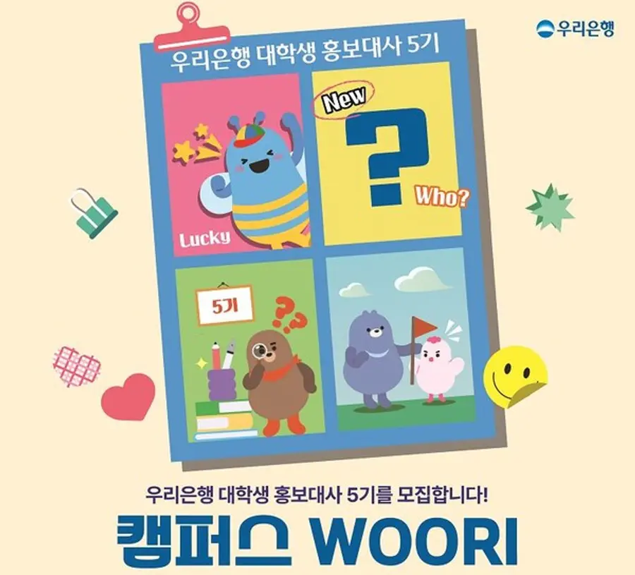 |스마트투데이=김국헌 기자| 우리은행이 오는 2월 3일까지 우리은행 대학생 홍보대사 ‘캠퍼스 WOORI(우리)’ 5기를 모집한다고 30일 밝혔다.